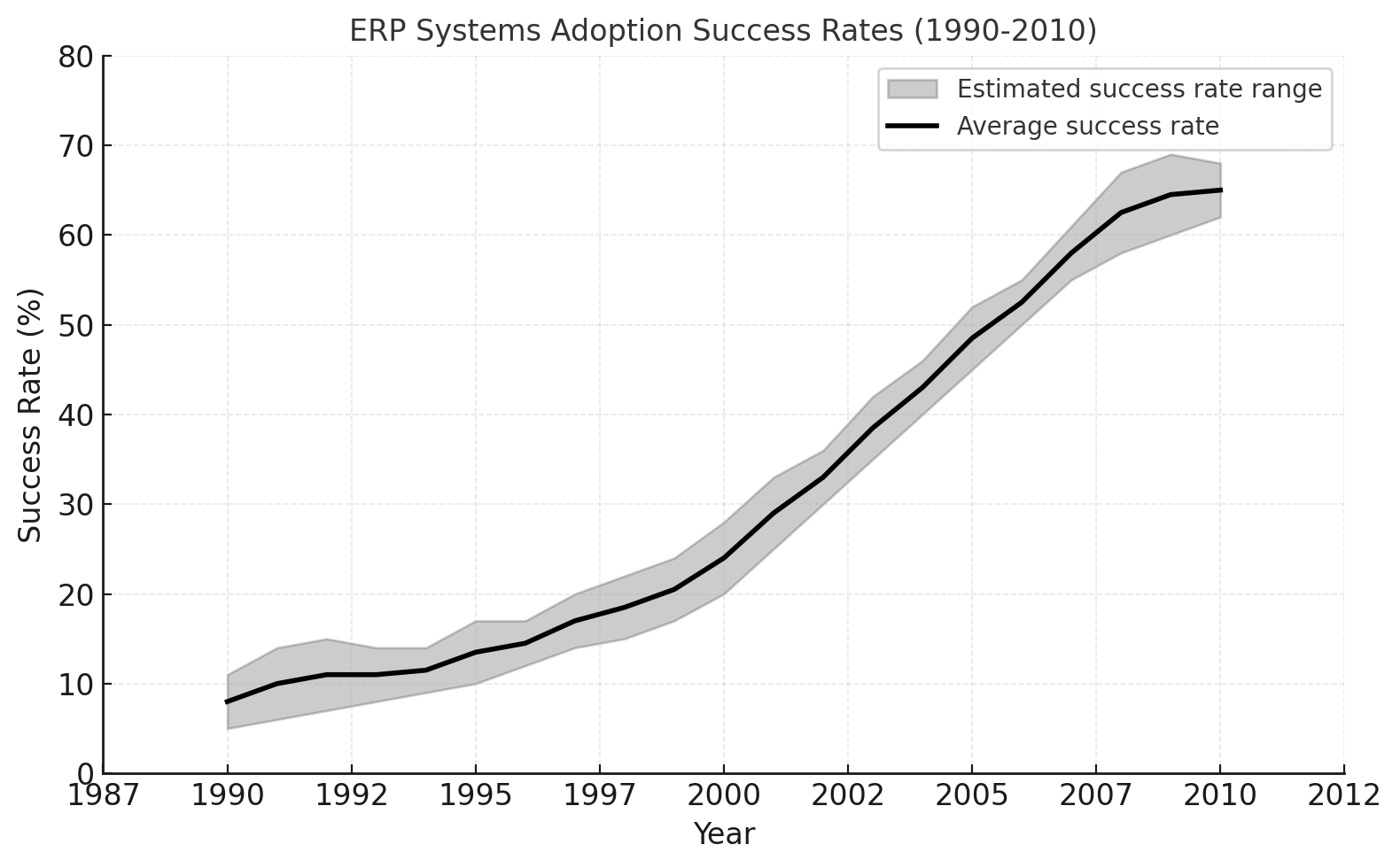 Enterprise Resource Planning (ERP) suites emerged in the 1990s as “an exotic beast” promising an integrated solution for all businesses. Early adoption was cautious – by the mid-90s only a small fraction of firms had fully implemented ERP. Failure rates were alarming: one study found only ~16% of IT projects succeeded in 1994, with large organizations faring worst at just 9%, which is about twice as good as GenAI custom implementations.