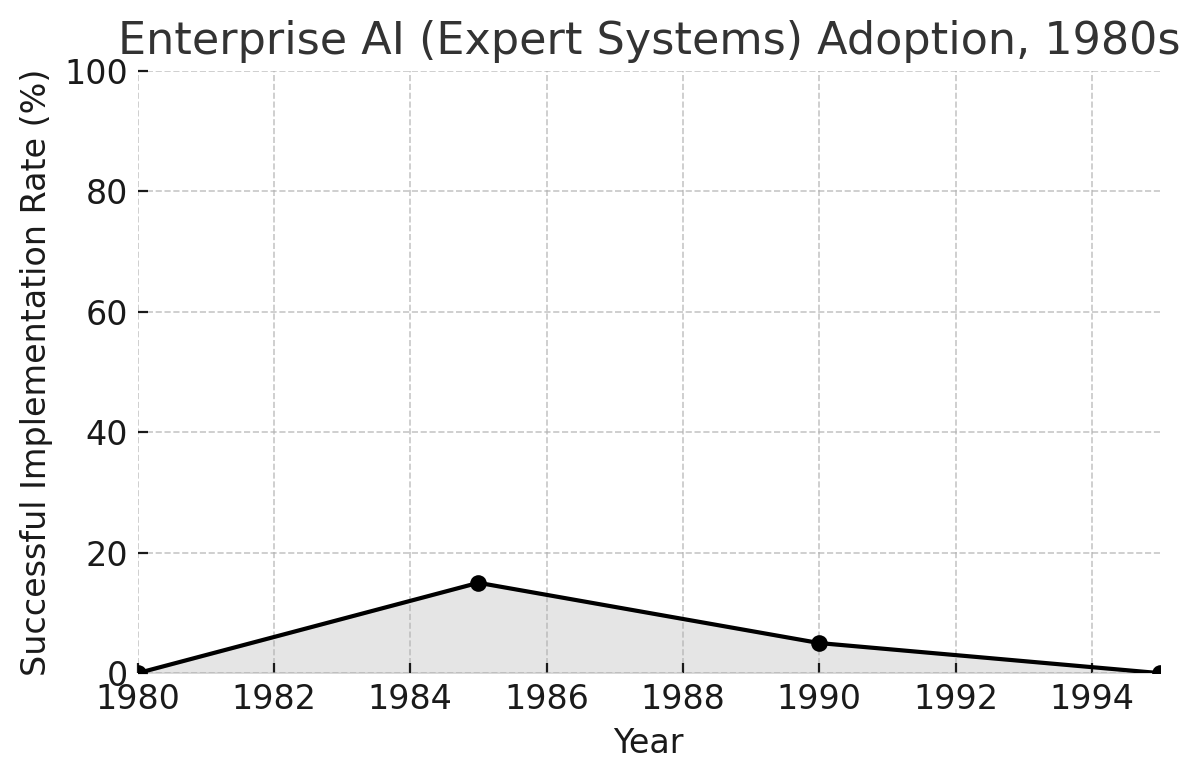 Despite an AI boom in the mid-1980s, when companies poured over $1 billion into developing expert systems, most initiatives failed to deliver lasting value. Early successes (like the XCON system at DEC) led to widespread enterprise adoption by 1985, but these rules-based systems proved brittle and expensive to maintain. By the early 1990s, AI’s grand promises hadn’t materialized, causing a collapse in enterprise interest. This “AI winter” saw many corporate AI divisions shut down as expert systems were abandoned due to their inability to learn or handle exceptions. The success rate of AI projects peaked in the 1980s at maybe ~10–15% and then plummeted near zero by the 1990s, exemplifying a wave that stalled after early hype.